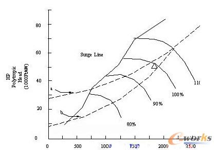 GM 離心鼓風(fēng)機(jī)的性能是非線(xiàn)性的曲線(xiàn),其性能的檢測(cè)來(lái)源于溫度傳感器,壓力變送器,流量變送器等檢測(cè)元件,就GM離心鼓風(fēng)機(jī)性能曲線(xiàn)來(lái)講,在機(jī)組流量和壓力調(diào)節(jié)過(guò)程中存在著喘振區(qū)和安全區(qū)(非喘振區(qū))。機(jī)組不允許在喘振區(qū)工作,故對(duì)機(jī)組控制的第一要求就是將其控制在安全區(qū),即做好防喘振控制。而多種控制方式是耦合在一起的PID回路,所以要達(dá)到控制要求,就必須解耦,使機(jī)組工作在安全區(qū),即不喘振。所謂喘振:如圖1,a和b虛線(xiàn)是管路阻力曲線(xiàn),當(dāng)改變流量和壓力時(shí),機(jī)組會(huì)在某區(qū)域造成管路急劇產(chǎn)生壓力和氣流的激烈的脈動(dòng)和振動(dòng),運(yùn)轉(zhuǎn)變得不穩(wěn)定了,將這種現(xiàn)象叫做喘振。