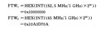 頻率調諧字是AD9957在單音頻工作模式下,實現信號調制的重要參數。對于中心載頻為63.75MHz,碼速率為5Mb/s的MSK調制系統,假定AD9957的內核時鐘為1GHz,其兩個載頻62.5MHz和65MHz的頻率調諧字(FTW)分別為: