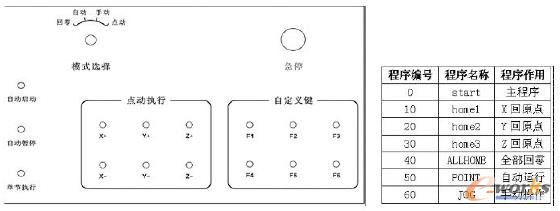 銑床的控制模式主要有手動、自動、點動和開機回零,運行中有還要有急停功能,另外幾個自定義的開關(guān),用于備用擴展功能。控制面板如圖。