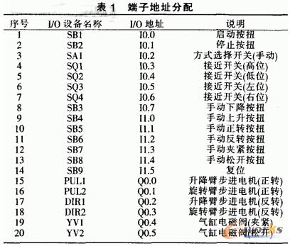 本文的機(jī)械手控制系統(tǒng)所采用的可編程控制器是德國西門子公司生產(chǎn)的S7-200CPU214該機(jī)械手控制系統(tǒng)。一共使用了14個輸入量。6個輸出量。端子地址分配如表1所示。