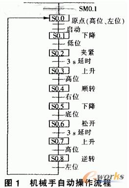 機(jī)械手自動操作流程如圖1所示。下降電磁閥通電,機(jī)械手下降。下降到底時(shí)。碰到下限位開關(guān),下降電磁閥通電。下降停止.同時(shí)夾緊電磁閥斷電,機(jī)械手放松。放松后,上升電磁閥通電,機(jī)械手上升。上升到頂時(shí).碰到左限位開關(guān),左移電磁閥斷電。左移停止.此時(shí)機(jī)械手經(jīng)過8步動作完成一個周期的動作。