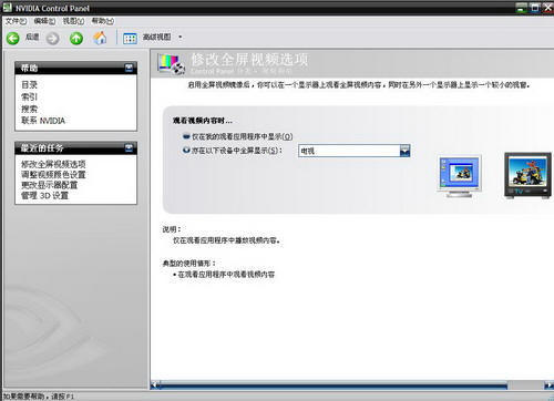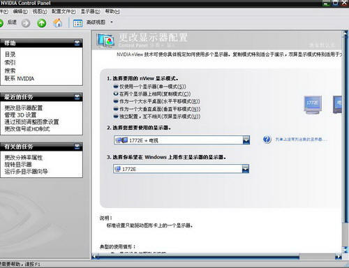 其設置方法和上面的電視設置差不多,不過也有兩點區別: 區別1:在視頻輸出上,顯示器使用的不是S端子,而是VGA接口或者DVI接口。 區別2:在進入NVIDIA驅動設置界面時,進入“更改顯示器配置”菜單,這里選擇“作為一個大水平桌面(水平平移模式)”一項,這樣才能夠使用擴展的桌面。 設置完成后我們只需要用暴風影音打開電影后,將暴風影音窗口拖曳到第二個顯示器上,全屏即可。