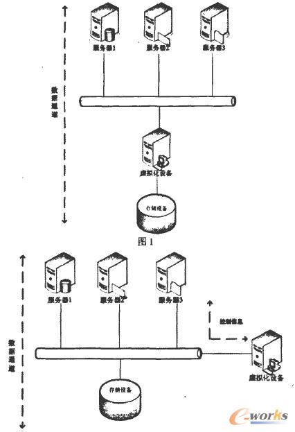 目前,存儲虛擬化的發展尚無統一標準。從存儲虛擬化的拓撲結構來講,有對稱式和非對稱式兩種,根據實現機制又分為帶內和帶外兩種基本類型。兩種方式的主要區別在于存儲網絡中數據I/O與控制信息是否使用同一通道,如圖1和2所示。