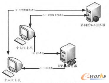 DNS服務器為提高查詢效率,有時可通過查詢緩存信息回復客戶端請求。當客戶端查詢頻繁到達服務器時,緩存機制將會大大提高其應答效率。DNS的查詢過程按兩部分進行:首先,DNS服務器解析客戶端的請求;當不能就地解析查詢時,可根據需要查詢DNS服務器來解析名稱。DNS查詢的過程如圖1所示。DNS查詢分為兩類: