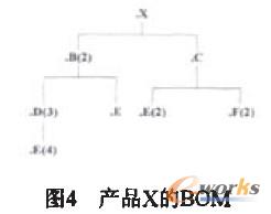 ②物料清單(BOM):是整個生產管理模塊的基礎,它是一張列表,包含著生產每單位產品所需要的所有部件、組件、零件與原材料等,如圖4所示:它用于維護企業產品的物料清單,維護產品的原料或配件的結構;BOM是MRP計算的基礎;在圖4中,組裝一個X需要B、C、D、E、F的數量:B-2,C-l,D-3*2=6,E-1*2+2*1+2*3*4=28;