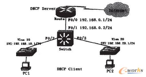說(shuō)明:本實(shí)例選用在路由器上配置DHCP服務(wù),為三層交換機(jī)下面Vlan10和Vlan20 的電腦分別分配192.168.10.0/24和192.168.20.0/24兩網(wǎng)段的地址。