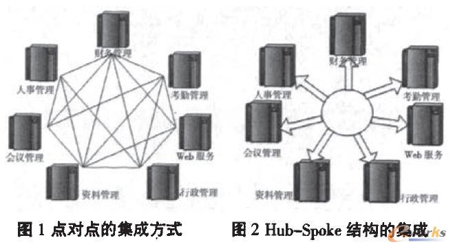 圖1所示點對點集成結構存在著嚴重的隱患,即隨著應用系統個數的增加。接口的數目將快速增長,其總數為n(n-1)個接口(n為應用系統個數)。應用系統之間存在著高度的耦合性。這為系統的維護帶來巨大的復雜性,任何一個系統的升級和改動都將影響到其他與之相關的應用系統的修改。隨著控制技術和信息技術的發展,企業信息化涉及到的子系統越來越多,點對點的集成方式已無法滿足需求。傳統的EAI技術試圖通過圖2所示:Hub-Spoke結構解決企業內部的整合問題。