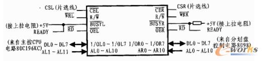 80C196KC和8098均有READY引腳,通過80C196KC和8098的時序可知,當READY引腳出現低電平時,CPU可自動插入WAIT等待周期,以延長讀寫和片選信號,因此,設計時將80C196KC和8098的READY引腳與IDT7132/7142的BUSY引腳相連就可在發生競爭時,自動使80C196KC或8098處于等待狀態。