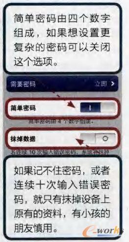iOS系統也可以像Windows系統那樣設置“開機密碼”:進入“設置/通用/密碼鎖定”,點擊“打開密碼”,這時會要求輸入四位密碼,輸入好后,下次再想進入系統,就得先輸入預先設置好的密碼了。這樣就可以確保ios用戶的資料不被外人查看。如果想設置更復雜的密碼,可以關掉“簡單密碼”,設置更長的密碼,不過萬一自己忘了密碼,那可就麻煩了。