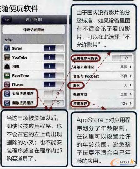 很多有小孩的朋友常常會碰到幾個問題:要么被孩子莫名其妙地安裝了一些付費軟件,要不自己重要的應用程序被孩子誤刪了,或者被他們看到一些不該看到的東西……這該怎么做呢?依次進入“設置/通用/訪問限制”,這是所有蘋果設備基本的設置選項。首先點擊“啟用訪問限制”,然后同前面一樣輸入四位密碼,下面灰色的軟件列表就可以操作了。如果不需要該操作了,點擊“停用訪問限制”,輸入之前設置的密碼就可以了。