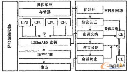 建立通信:CE之間的連接通過標簽邊緣路由進行建立。在MPLS網絡中,LSP(Labelb Switch Path,標簽交換路徑)是由兩個端點間的標記所決定的,分為動態LSP和靜態LSP兩類。動態LSP是由路由信息生成的,而靜態LSP是指定的。邏輯分區使用AES算法對數據進行加密這種加密是基于ECB( Electronic Code Book,電子源碼書)模式的,通過這種模式,數據流會快速傳送給云用戶。加密使用的是一次性密鑰,即使數據包被探測到也很難對其解密,使得數據的安全性得到充分保證。