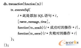 需要注意的是,函數具有一個事務類型的參數(tx),該事務參數具有一個函數executeSql(),包含SQL操作語句、相應的數據與時間、一個成功時執行的函數和一個失敗時執行的函數。