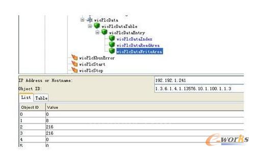 在表2中,組Plc Data Group中的wioPlcDataWriteArea (1.3.6.1.4.1.13576.10.1.100.1.1.3)可顯示存儲(chǔ)255個(gè)DWORD類型的數(shù)據(jù),這些數(shù)據(jù)均來(lái)自于750-841現(xiàn)場(chǎng)總 線節(jié)點(diǎn),通過(guò)其內(nèi)部的控制程序確定每一個(gè)單元的數(shù)據(jù)分配,這些數(shù)據(jù)可以是通過(guò)IO模塊從工業(yè)現(xiàn)場(chǎng)直接采集的數(shù)據(jù)也可以是控制器內(nèi)部所生成的中間變量。 wioPlcDataReadArea(1.3.6.1.4.1.13576.10.1.100.1.1.2)同樣可以存放255個(gè)DWORD類型的數(shù) 據(jù),但這些數(shù)據(jù)是由網(wǎng)絡(luò)管理系統(tǒng)進(jìn)行設(shè)置并傳送到750-841現(xiàn)場(chǎng)總線控制器,可用于控制現(xiàn)場(chǎng)設(shè)備或供750-841控制器內(nèi)部使用。