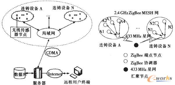 鋼鐵連鑄設備數據采集總體結構如圖1所示。主要包括連鑄設備(A,…,N)采集節點模塊、傳感器及鋼鐵連鑄設備參數的局域網、CDMA無線通信網絡、鋼鐵連鑄設備遠程服務器、數據庫以及遠程用戶終端等幾個部分。