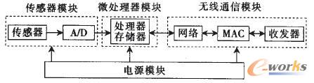 鋼鐵連鑄設備數據采集系統的核心是連鑄設備傳感器節點,傳感器節點的結構包括傳感器模塊、微處理器模塊(由嵌入式系統構成,包括CPU、存儲器等)、無線通信模塊和電源模塊四個單元,如圖2所示。其中,傳感器模塊完成監測區域內信息的采集和信號轉換;處理器模塊負載控制整個傳感器節點的操作、存儲和處理本身采集的數據;無線通信模塊負責與其他傳感器節點進行無線通信,交換控制信息和收發采集數據;電源管理模塊為其他功能模塊單元提供正常工作所必需的能源。
