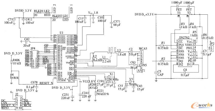 微處理器模塊選用了TI公司的CC2430芯片。CC2430芯片上集成了ZigBee射頻CC2420芯片,其具有優良的無線接收靈敏度和強大的抗干擾性,并集成了內存和一個8 bit的8051微控制器,具有128 KB的RAM和高性能、低功耗的微控制器,還包含模擬數字轉換器(ADC)、幾個定時器(Timer)、AES128協同處理器、看門狗定時器、32 kHz晶振的休眠模式定時器、上電復位電路、掉電檢測電路,以及21個可編程I/O引腳。CC2430芯片采用7 mm×7 mm QPL封裝,共有48個引腳,分為電源線引腳、控制線引腳和I/O端口引腳;采用0.18μm CMOS工藝,工作時的電流損耗為27 mA,在接收和發射模式下,電流損耗分別低于27 mA或25 mA。CC2430具有休眠模式和轉換到主動模式的超短時間的特性。