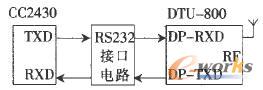鋼鐵連鑄設備數據采集系統采用CDMA無線通信方式,向遠程服務器發送數據。相對于GPRS方式而言,CDMA無線傳輸方式在穩定性、速度、帶寬等方面更具優勢。CDMA無線通信模塊選用AnyDATA公司的DTU800,為目前世界上同類型產品中體積最小、速度最快的CDMA數據模塊,數據傳輸速率最高可達153.6 kb/s,平均速率為80 kb/s~100 kb/s。CDMA無線通信模塊與處理器的連接較為簡單,將DTU 800的標準串口與處理器的串口連接即可,接口電路如圖5所示。本設計使用CC2430的USART0端口(TXD、RXD引腳)與DTU800的USART1端口(DP_TXD、DP_RXD引腳)傳輸數據。DTU800內嵌TCP/IP協議棧,大大降低了數據通信設計的難度,也增強了微處理器處理其他數據的能力。DTU800支持標準的AT指令,DTU與MCU主機單元的通信可通過調用相應的AT指令實現。