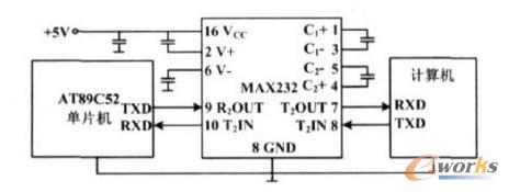 測試夾具中的單片機和計算機之間的數據傳送是通過RS2232串行口實現的。計算機向單片機傳送控制命令和數據,由單片機把信號傳輸到電子線路板上,然后再測量電子線路板的輸出信號,通過串行口回傳給計算機。串行口數據通信協議是:數據傳輸速率為9 600 bp s, 1位開始位, 8位數據位, 1位停止位,無奇偶校驗位。由于僅僅是單片機與計算機相互傳送信息,都是在生產現場工作,所以RS2232 串行口只需要接收、發射和地三根導線,也不存在傳輸距離的問題。電子線路板的信號都是開關量信號或模擬電壓值,線路板輸出的信號也是電信號,當通信傳輸速率為9 600bp s時,最快速度是每1. 04 ms發送一個字節。測試夾具中的單片機采用AT89C52芯片,它的邏輯電平與計算機的RS2232的接口電平不一致,需要在單片機和計算機的RS2232串行口之間設計一個MAX232芯片,該芯片可以實現把單片機的0 V、+ 5 V電壓轉換成RS2232接口的邏輯“1”電平( - 3~ - 15 V)和邏輯“0”電平( + 3~ + 15 V) ,MAX232芯片的應用結構如圖3所示。