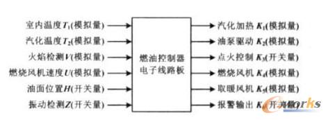 燃油取暖器的電子線路板各有4個模擬量、2個開關量輸入信號和輸出控制信號,如圖1所示。一般,在線路板的設計中,只需要考慮線路板的輸入、輸出信號接插件的結構。在這里是用仿真的方法來實現測試任務的,由計算機向線路板輸入測量信號并接收線路板的輸出信號,所以在設計電子線路板的時候,需要在線路板上設計相應的測試點,把這些輸入點和輸出點安排在適當的位置,讓計算機能夠輸入和檢測這些信息。