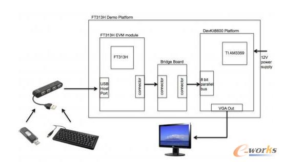 這個電路中的演示平臺(可以接入DevKit8600平臺,VGA適配器,橋接板和EVM模塊),產品編號為UMFT313EV。它可以方便的在市場上買到并集成到嵌入式系統做為設計的原型驗證。