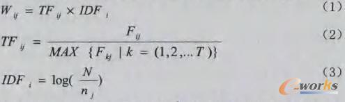 公式(1)中,Wij表示在文檔dj中,關(guān)鍵字 所占的比重。 由其Wij對應(yīng)的TFij值和IDFi值計算得出。這兩部分的計算公式如公式(2)和公式(3)所示。在公式(2)和公式(3)中,F(xiàn)ij表示關(guān)鍵字Ki 在文檔dj中的出現(xiàn)頻率,文檔dj中包含T個關(guān)鍵字,N表示文檔總數(shù), Nj表示包含關(guān)鍵字Ki的文檔總數(shù)。