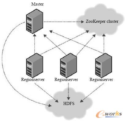 Hadoop HBase是基于Google Bigtable的開源實現,屬于Hadoop的一個子項目。Hadoop HBase可通過利用Hadoop HDFS提供的文件存儲系統,HadoopMapReduce 提供的海量數據處理能力和HadoopZookeeper提供的協同服務,構建一個高可靠性、高性能、面向列、可伸縮的分布式存儲系統。這種分布式存儲系統的特點是實現可在廉價節點上搭建起大規模結構化存儲集群。HBase由一個主節點(Master)協調一個或多個區域服務器(Regionserver)從節點組成,見圖2。