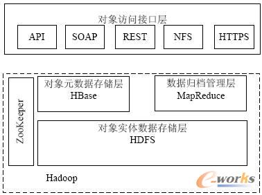 對象訪問接口層提供了主流的Web服務接口,主要負責為云端應用提供訪問接口。在Hadoop開源框架下實現可供應用層調用的API接口、外部應用可以通過接口調用實現對對象元數據的創建、查詢和刪除等功能。