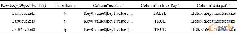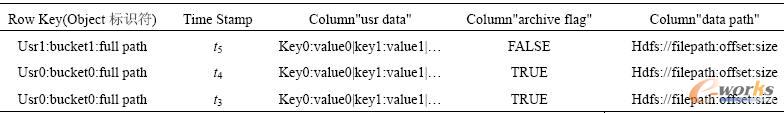 對象元數據存儲層主要利用HBase開源架構實現了對象元數據的管理等功能。HBase介于NoSQL和RDBMS之間,僅能通過主鍵(row key)和主鍵的range來檢索數據,僅支持單行事務。該模型的對象元數據存儲層共設計了三張表,分別是用于存儲對象元數據索引信息的索引容器表,索引容器表結構見表1,用于描述對象元數據信息的對象元數據表,對象元數據索引表見表2和描述用戶刪除的失效數據的已刪除數據表,已刪除數據表結構見表3。對象元數據存儲層建立在HBase之上,通過管理和維護這三張表實現了對象元數據的創建、查詢和刪除,以及小文件數據歸檔的功能。當訪問層提交創建數據請求后,系統會檢查訪問合法性和索引容器表的容量,如果索引容器表的容量不夠,將會創建一條新的對象元數據索引容器記錄。通過檢查后將對象元數據信息添加至對象元數據索引表,同時更新索引容器表的容量,最后將對象元數據存儲到HDFS文件系統中。當訪問層提交刪除數據請求后,系統會檢查訪問合法性,通過檢查后刪除對象元數據在對象元數據索引表中的索引信息,同時在已刪除數據表添加一條刪除數據記錄,更新索引容器表容量,進入數據歸檔周期時,系統將會刪除HDFS文件系統中的對象元數據。