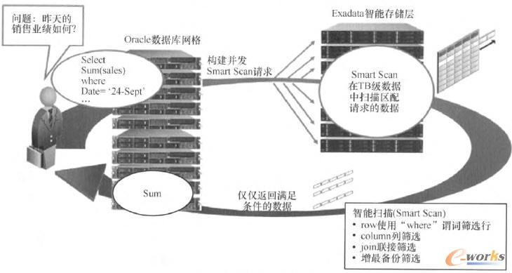 Exadma將數(shù)據(jù)庫(kù)計(jì)算分成計(jì)算密集型處理和存儲(chǔ)密集型處理,分別在DB服務(wù)器和存儲(chǔ)服務(wù)器完成。采用智能存儲(chǔ)技術(shù)(Smart Scan),實(shí)現(xiàn)了存儲(chǔ)層完全并發(fā)式、智能化的預(yù)處理,提高了數(shù)據(jù)的處理效率,并降低了DB服務(wù)器的處理負(fù)擔(dān),如圖7所示。