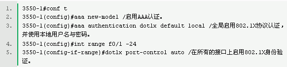 配置802.1X身份驗證協議,首先得全局啟用AAA認證,這個和在網絡邊界上使用AAA認證沒有太多的區別,只不過認證的協議是802.1X;其次則需要在相應的接口上啟用802.1X身份驗證。(建議在所有的端口上啟用802.1X身份驗證,并且使用radius服務器來管理用戶名和密碼)