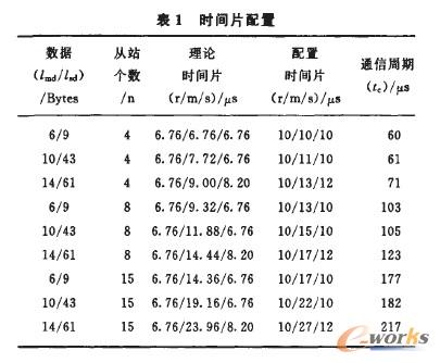 為減少t。,。或服務開銷6r,實驗中采用旁路TCP/IP,直接在以太網網絡接口卡(Network Inter—face Card,NIC)上發送和接收數據的方式來減少這方面的延遲。表1所示為實驗中采用的九種場景,以及時間片的理論計算和實際配置值的比較,理論計算方法參見2.3節。為簡化計算,時長一數據長度/網絡帶寬,帶寬采用100 Mbps,時間域長4Byte,報文類域長2 Byte,控制字、狀態字2 Byte,邏輯地址1 Byte,服務開銷忽略。從表1中可以看出,在4個從站的情況下,傳輸6 Byte/9 Byte的‰/Zsd數據,通信周期可以配置為60“s;在15個從站的情況下,傳輸14 Byte/61 Byte的lmd/15d數據,通信周期可以配置為217“s。分析表1中數據可以看出,時間片的實際配置值比理論計算值稍大了些,原因為:①理論計算中忽略了服務開銷和端系統處理時間;②若要考慮重傳等可靠性處理,還需將通信周期配置得更大一些,留空隙用于重傳處理。