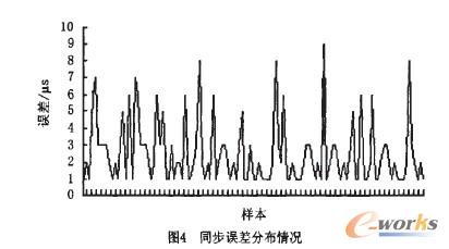 根據該測試方法設計了測試實驗。為了運行誤差測量程序,將通信周期延長為正常部分和測量部分。正常部分完成同步與實時通信,測量部分完成誤差測量。為減少測量過程中t。。時間不確定性所帶來的誤差,采用接近硬件層的處理方法。通過對大量誤差樣本的統計分析,誤差平均值為6弘s。最大值不超過10弘s。圖4所示為測量所得誤差的分布情況。