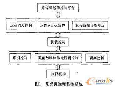 采煤機遠程控制系統主要由遠程控制平臺、工業以太網、機載控制和執行機構四大部分組成,其功能是實現采煤機的遠程控制,包括遠程PLC控制、遠程WinCC監控以及遠程故障診斷。系統結構體系如圖1所示。