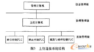 上位連接系統是位于控制中心的一個自動化綜合管理系統。上位計算機通過串行通汛接口與西門子S7—300PLC的串行通訊接口相連,對PLC進行監視和管理,構成集中管理、分散控制的分布式多級控制系統。在這個控制系統中,西門子S7.300PLC為直接控制級,負責綜采工作面采煤機各變量的監測與控制,同時接受上位計算機傳來的信息和向卜位計算機發送現場采集的數據。上位計算機是協調管理級,它與下位直接控制級、自身人一機界l面交互層和上級信息管理級進行數據交換,是連接過程控制和信息管理的橋梁。上位計算機與PLC的通訊采用RS232C/RS422通信接口;上位計算機與信息管理計算機的通信采用局域網。