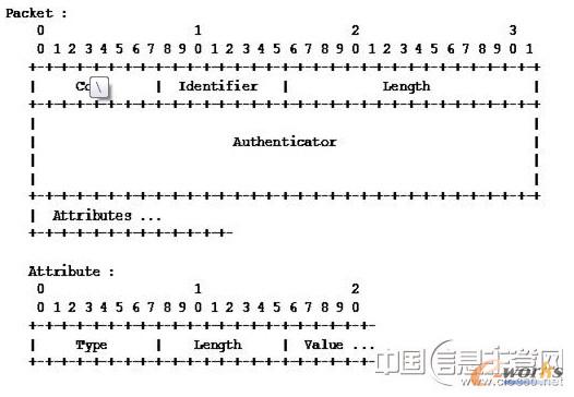 Radius通信是用UDP協(xié)議以“請(qǐng)求 - 響應(yīng)”方式進(jìn)行的,即:客戶發(fā)送一個(gè)請(qǐng)求包,服務(wù)器收到包后給予響應(yīng),其數(shù)據(jù)包格式如下: