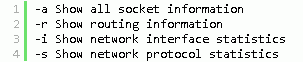 Netstat 和 ps 命令類似,是 Linux 管理員基本上每天都會用的工具,它顯示了大量跟網(wǎng)絡相關的信息,例如 socket 的使用、路由、接口、協(xié)議、網(wǎng)絡等等,下面是一些常用的參數(shù):