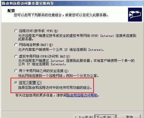 彈出“路由和遠(yuǎn)程訪問服務(wù)器安裝向?qū)А睂υ捒颍瑔螕粝乱徊剑x中自定義配置,下一步,選擇自定義配置,如圖: