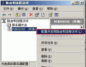 首先安裝“路由和遠(yuǎn)程訪問”,或者在運(yùn)行里輸入“rrasmgmt.msc”,在彈出的“路由和遠(yuǎn)程訪問”管理控制臺窗口中,單擊配置并啟用路由和遠(yuǎn)程訪問,如圖所示: