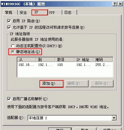 隨即,VPN服務(wù)即成功啟動。單擊服務(wù)器名稱-屬性,在彈出的對話框中選中 IP 選項(xiàng)卡,在IP地址指派中選中靜態(tài)地址池,單擊添加,如圖所示: