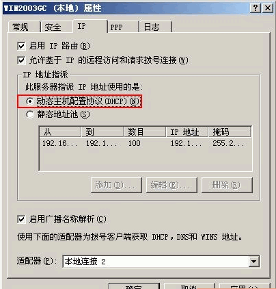 起始IP地址和結(jié)束IP地址可以自定義一段IP地址(如192.168.0.10至192.168.0.50)如這臺主機(jī)已經(jīng)配置了DHCP服務(wù),也可以選擇動態(tài)主機(jī)配置協(xié)議(DHCP),會延長連接時(shí)間。