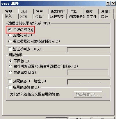 2. 在test屬性對話框中,單擊撥入選項(xiàng)卡。在遠(yuǎn)程訪問權(quán)限中選中允許訪問,單擊確定,如圖所示:
