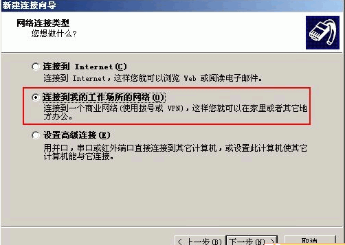 2. 彈出“歡迎使用新建連接向?qū)А保乱徊剑W(wǎng)絡(luò)連接類型頁面中選擇“連接到我的工作場所的網(wǎng)絡(luò)”。下一步,如圖所示:
