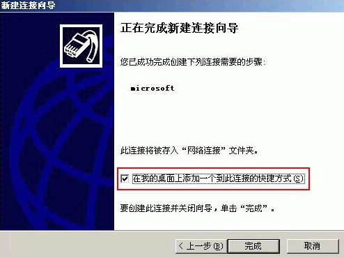7. 在完成新建連接向?qū)е校x擇“在我的桌面上添加一個(gè)到此連接的快捷方式”,完成;