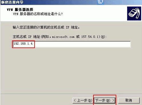 5. VPN服務(wù)器選擇中,選擇主機(jī)名或者IP地址,下一步;