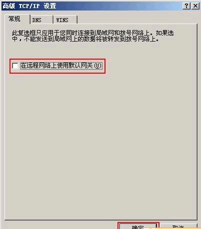 在“高級TCP/IP設(shè)置”對話框的“常規(guī)”中取消選中的“在遠(yuǎn)程網(wǎng)絡(luò)上使用默認(rèn)網(wǎng)關(guān)”,單擊確定,如圖所示。