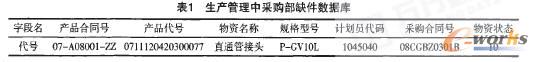 本部分設計是結合生產管理中缺件子系統功能模塊進行的數據庫設計(見表1)。