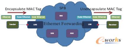 SPBM是標準的MACinMAC封裝,在SPB區域中數據報文也都是依靠外層MAC做傳統Ethernet轉發。外層Ethernet報頭中的源目的MAC就代表了SPB區域邊緣的UNI設備,此設備MAC是由L2 ISIS在SPB區域中傳遞的。