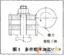 對(duì)某些小型零件,可采用多件加工。如圖1所示,一次裝卡加工4個(gè)齒輪,既可減少安裝夾緊的輔助時(shí)間,也可減少加工時(shí)的對(duì)刀時(shí)間和切人切出時(shí)間。