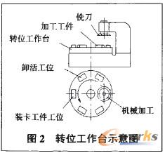 在機(jī)械制造過程中,輔助時(shí)間是影響工時(shí)定額的一個(gè)重要因素,應(yīng)盡可能地使輔助時(shí)間與機(jī)械加工時(shí)間重合。比如我廠的上旁承加工工藝。如圖2所示,采用轉(zhuǎn)位工作臺(tái),機(jī)床可連續(xù)進(jìn)行加工,工人可同時(shí)進(jìn)行工件的裝卸。
