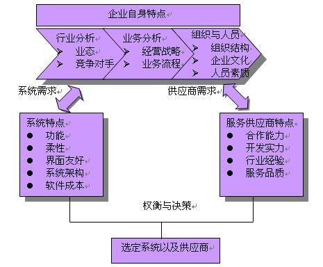 在認真分析了企業自身的情況后,企業將對軟件系統和供應商有了具體的需求,只有滿足這些需求的軟件產品和相應的供應商才將是企業的合適選擇。而這些需求將對應于關于各個軟件產品和供應商特點。對軟件系統的情況,我們需要關注的如系統功能、系統柔性、界面友好性、系統架構和軟件成本等因素。對服務供應商的情況,我們需要關注合作能力、開發實力、行業經驗、服務品質等因素。這樣企業就可以選擇出最適合企業需求的軟件產品和供應商。
